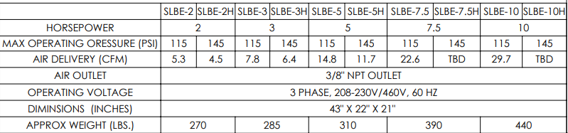 Anest Iwata SLBE Oil Less Scroll Compressors (Enclosed). Available in multiple configurations and horsepower levels. These are similar to the SLB models, but in an enclosed configuration. See below for specs. H Models are available upon request.
